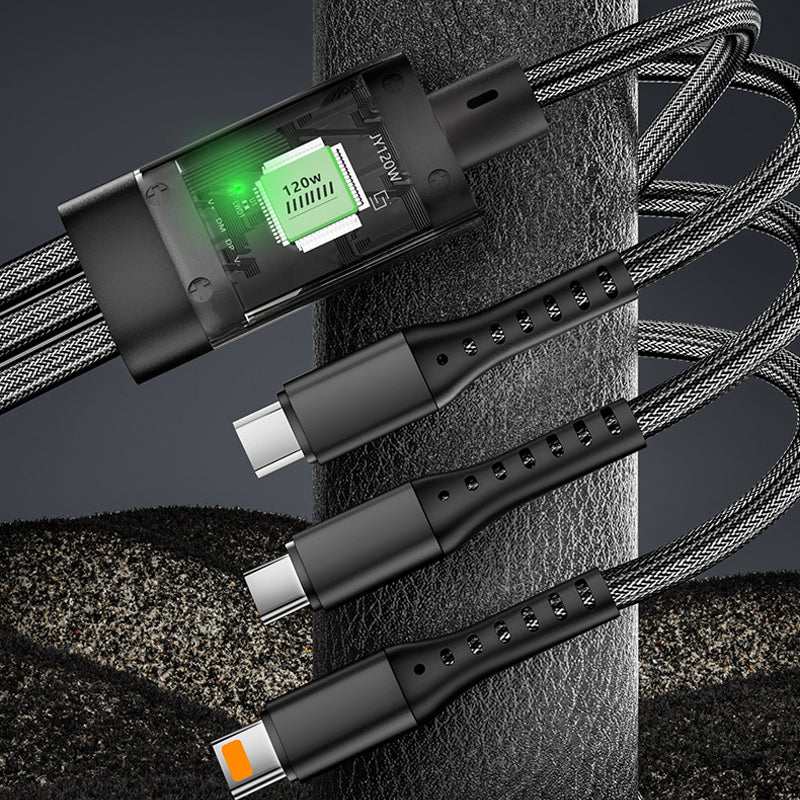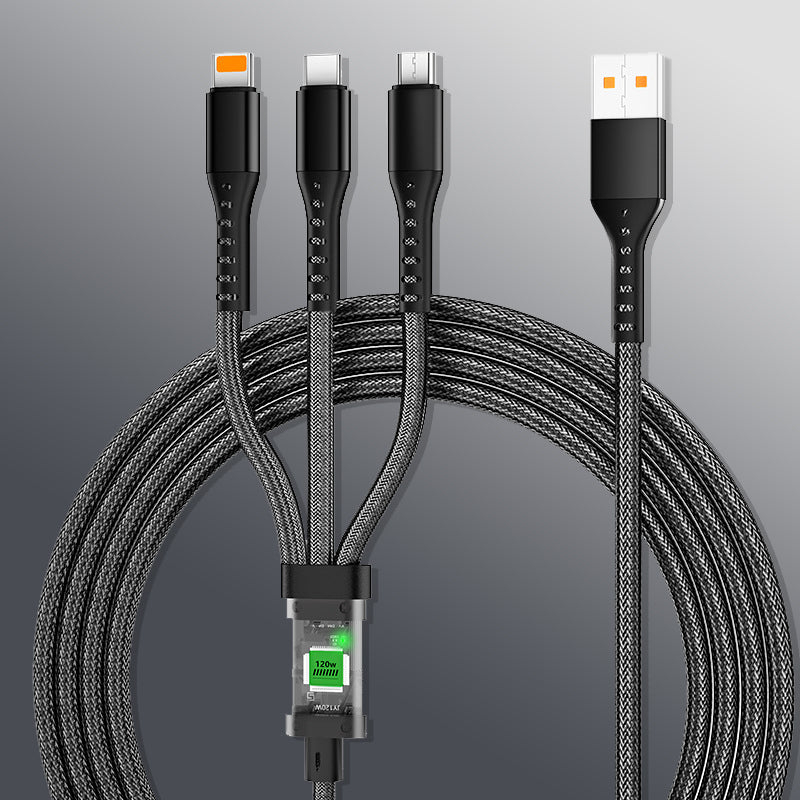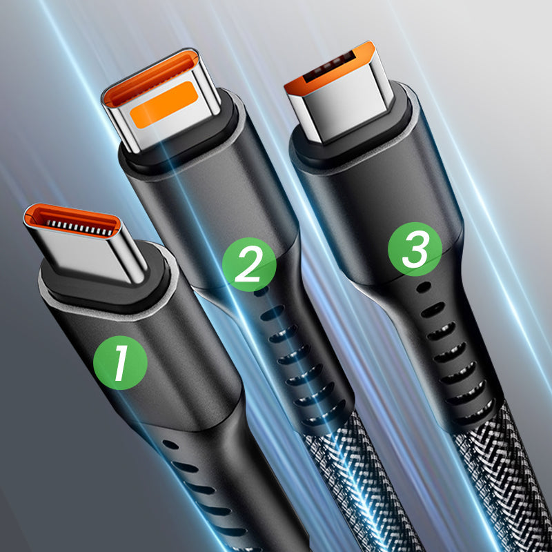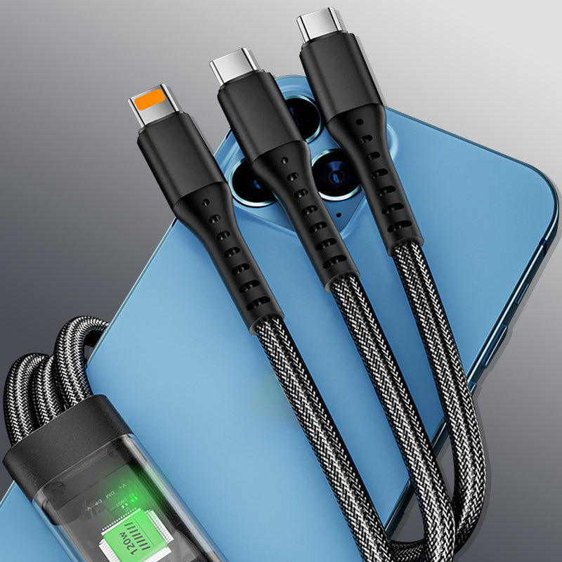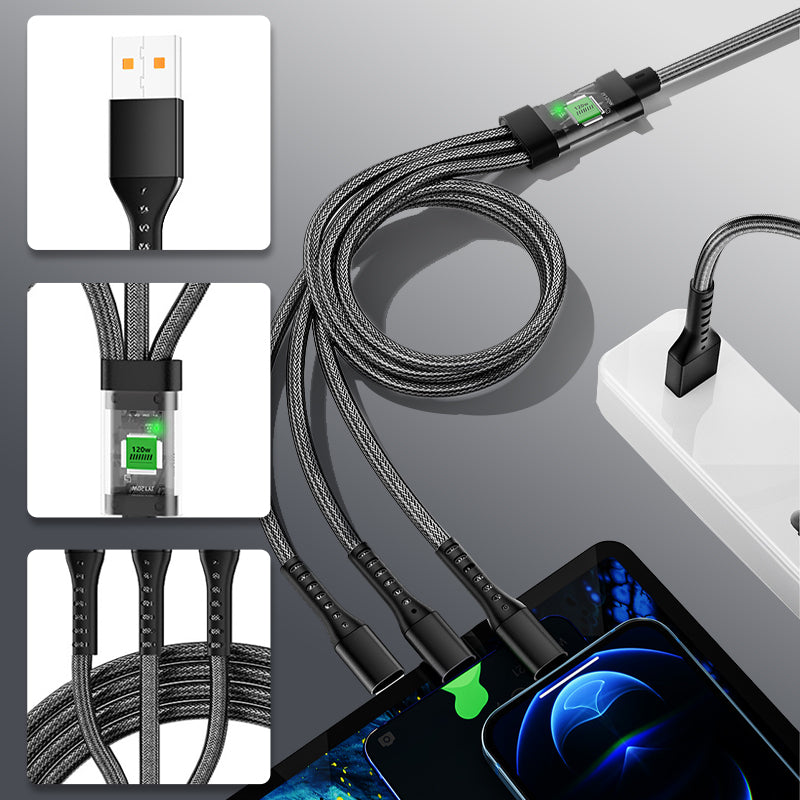 Experience the ultimate convenience with the 120W 3-in-1 Fast Charging Cable. Charge multiple devices simultaneously while enjoying stable charging, a subtle night light effect, and durability that withstands over 10,000 bends.