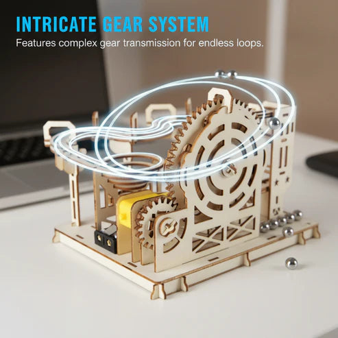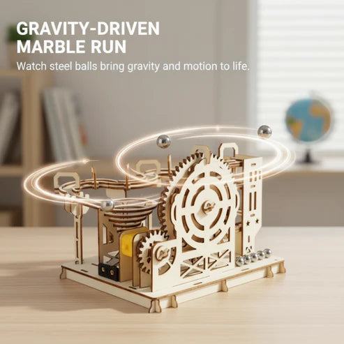 GRAVITÁCIÓS MARMORÚT - Nézze meg, ahogy az acélgolyók kanyargós pályákon, spirálokon és lejtőkön haladnak. Ez a lenyűgöző látvány a fizika alapelveinek, például a lendületnek és a gravitációnak a valós világban történő bemutatását nyújtja.