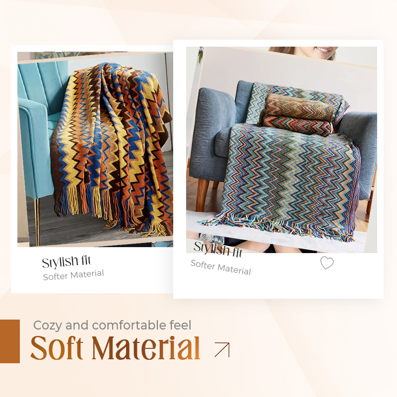 ÉLÉNK BOHO MINTA - A takaró élénk, bohém stílusú mintával rendelkezik. Színes, piros, sárga, kék és barna színű cikk-cakk minták díszítik. Ezek a szemet gyönyörködtető minták művészi hangulatot és egyéniséget kölcsönöznek lakóterének.