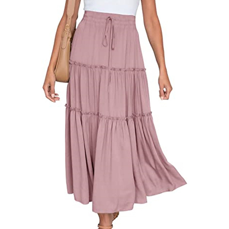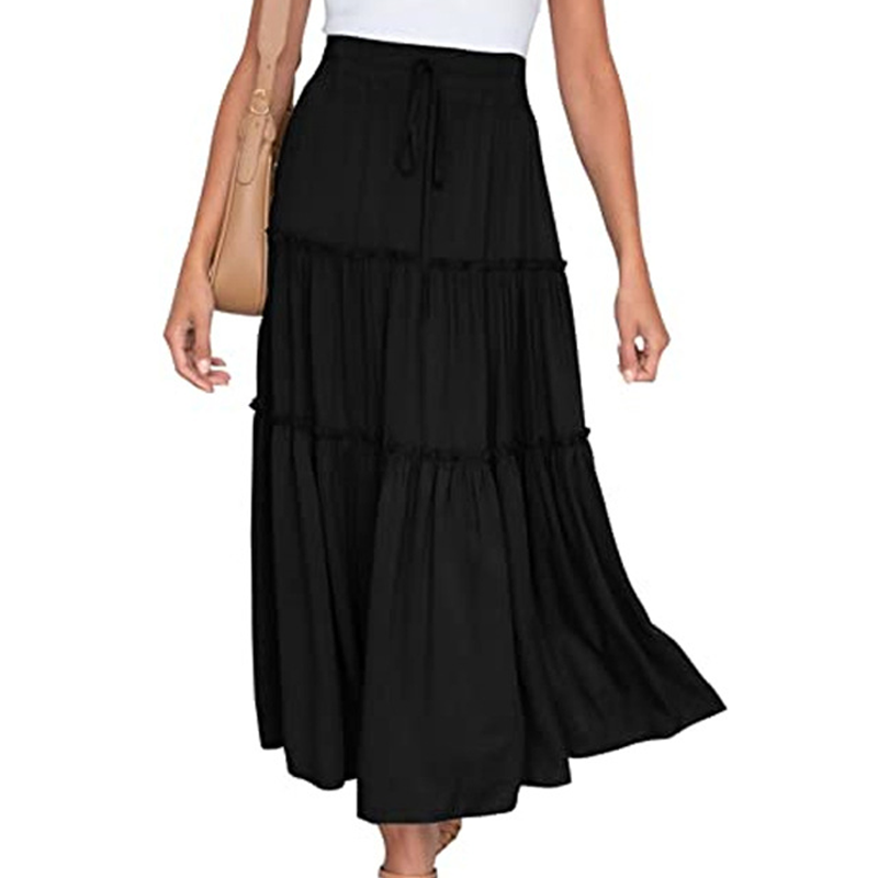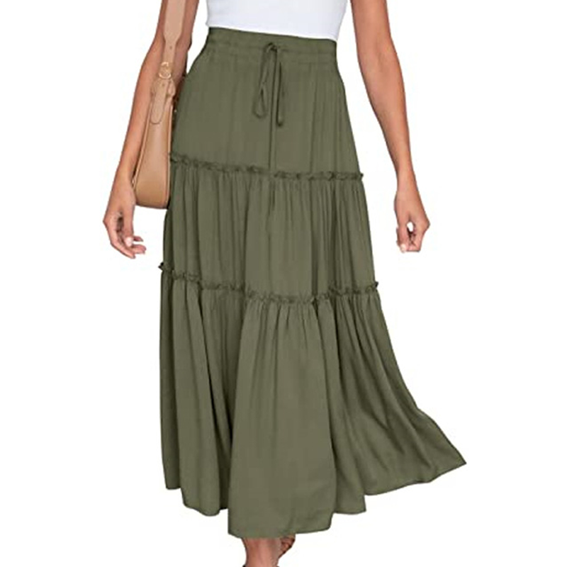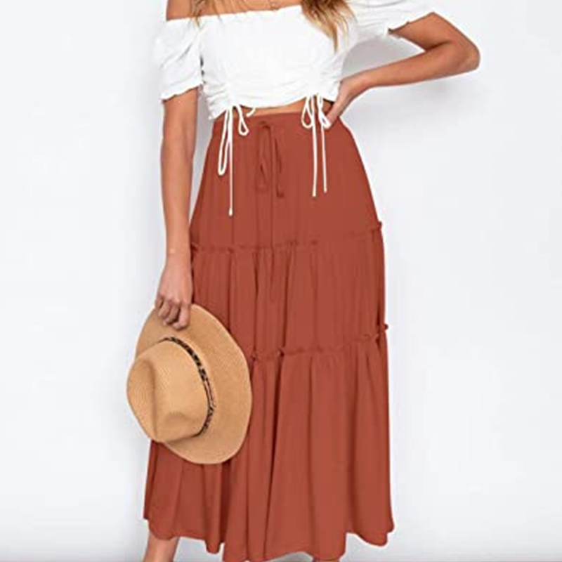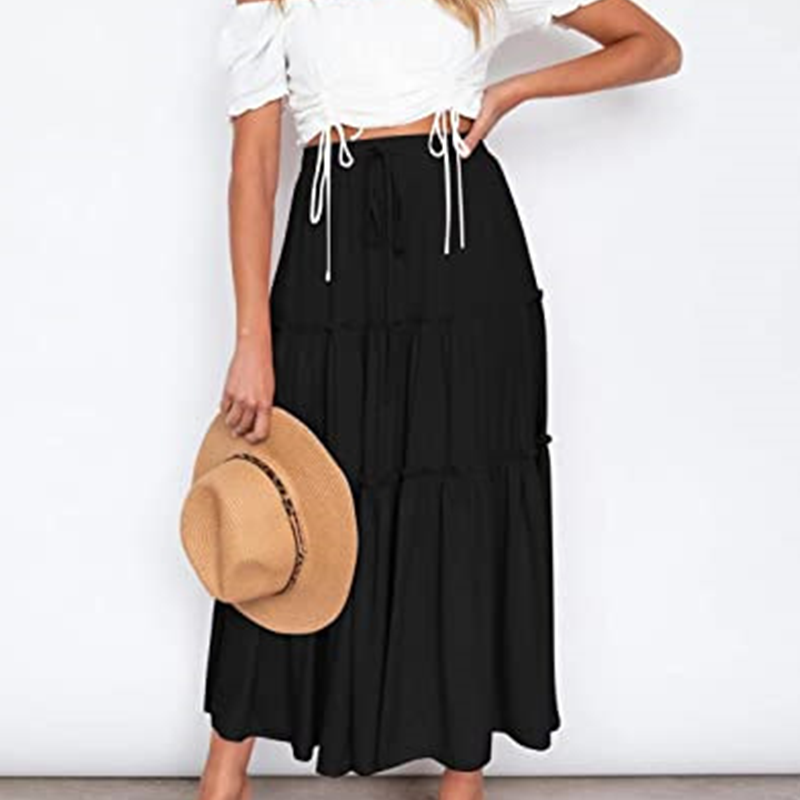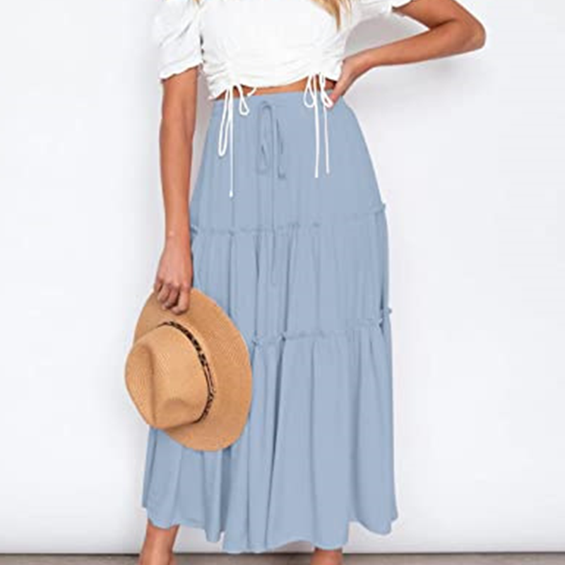 BOHO - SIKKES STÍLUS: A bohém rakott szoknya a szabad szellemű bohém stílust testesíti meg. Többszörös rakása romantikus és lenge megjelenést kölcsönöz, míg az oldalsó húzózsinóros kialakítás divatos hatást kelt. Egy fehér, váll nélküli felsővel és szalmakalappal párosítva gondtalan és divatos hangulatot áraszt, tökéletes tengerparti nyaraláshoz vagy zenei fesztiválokra.