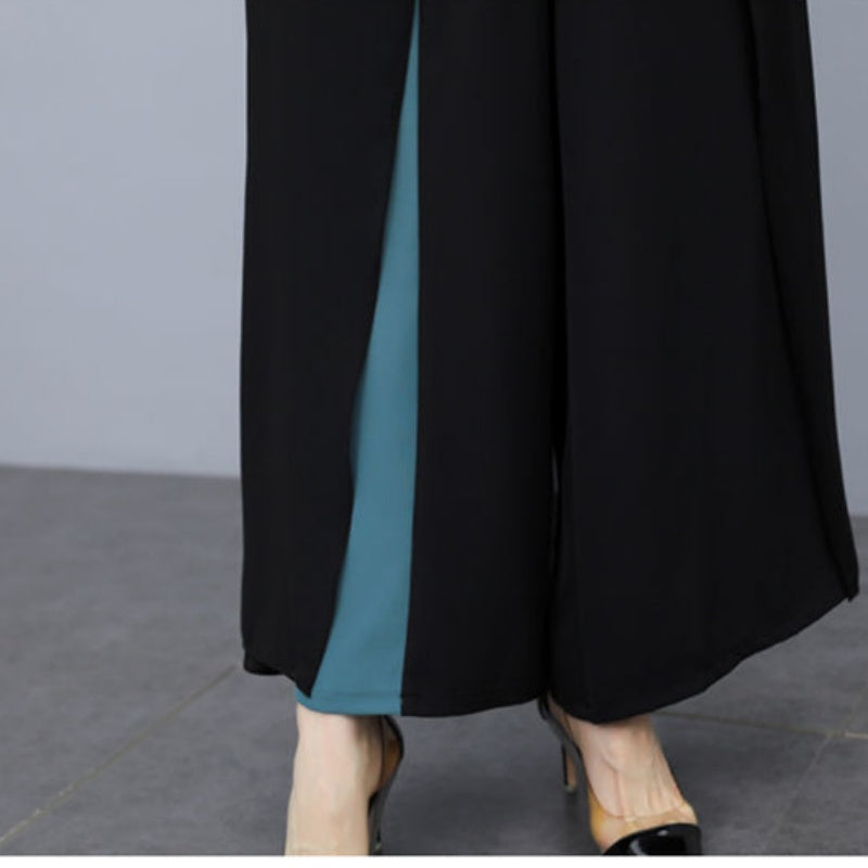 SZÍNES BLOKKOLÓ SZEGÉLY RÉSZLETE: A nadrág szegélyénél található merész, színpompás akcentus vizuális dimenziót és egy kis kortárs hangulatot kölcsönöz a nadrágnak. Ez a modern dizájnelem kiemeli a ruhát a többi közül, és fokozza annak divatos vonzerejét anélkül, hogy túlzásba vinné a megjelenést.
