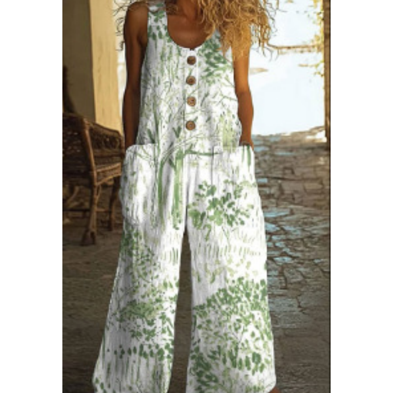 KÉNYELMES UJJATLAN KIALAKÍTÁS ÉS SZÉLES LÁBAK A LÉGÁTERESZTŐ VISELET ÉRDEKÉBEN: Az ujjatlan szabás és a széles szárú nadrág maximális kényelmet és légáteresztő képességet biztosít, így ez a kezeslábas ideális a meleg időben. A könnyű anyag lehetővé teszi a korlátlan mozgást, míg a széles lábak laza, bohém sziluettet alkotnak, amely minden testalkatnak hízeleg.