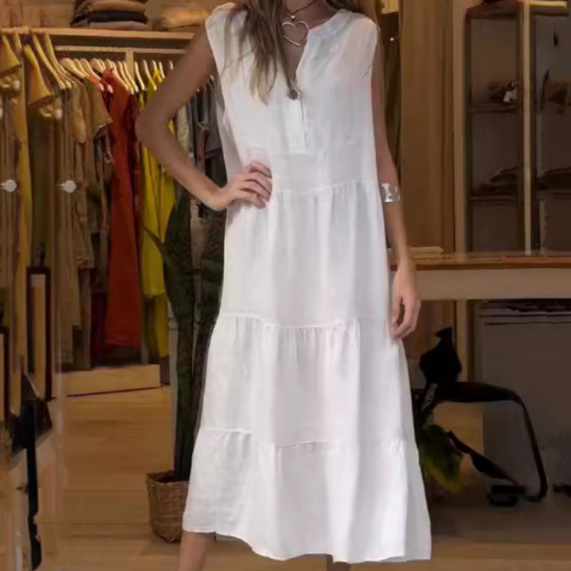Tegyen divatos nyilatkozatot a női V-nyakú, gombos, ujjatlan, emeletes hosszú ruhánkkal. Ez az elegáns és stílusos maxiruha tökéletes nyári alkalmakra, legyen szó kerti partiról, tengerparti nyaralásról vagy egy laza kirándulásról.