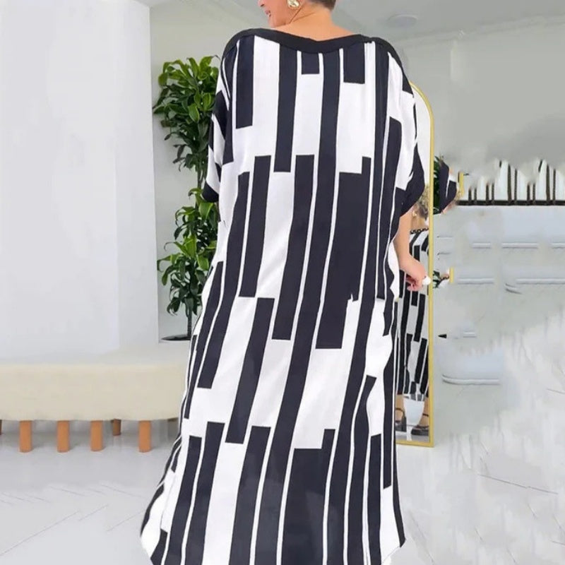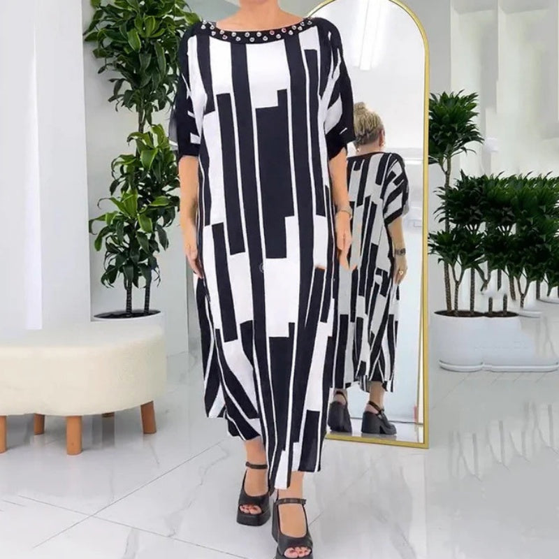 MODERN STÍLUS – Az elegáns fekete-fehér mintával tervezett ruha merész divatnyilatkozatot tesz, miközben időtlen eleganciát tart fenn, amely jól illik mind az alkalmi, mind a fél-formális beállításokhoz.