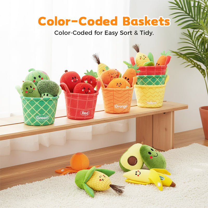 SZÍNKÓDOLT KOSARAK - A készlet színes kosarakat tartalmaz, amelyek segítenek a válogatási és szervezési készségek elsajátításában. A játék után a plüss játékok szépen elrakhatók, elősegítve a rendetlenséget és egyszerűvé és gyorssá téve a takarítást.