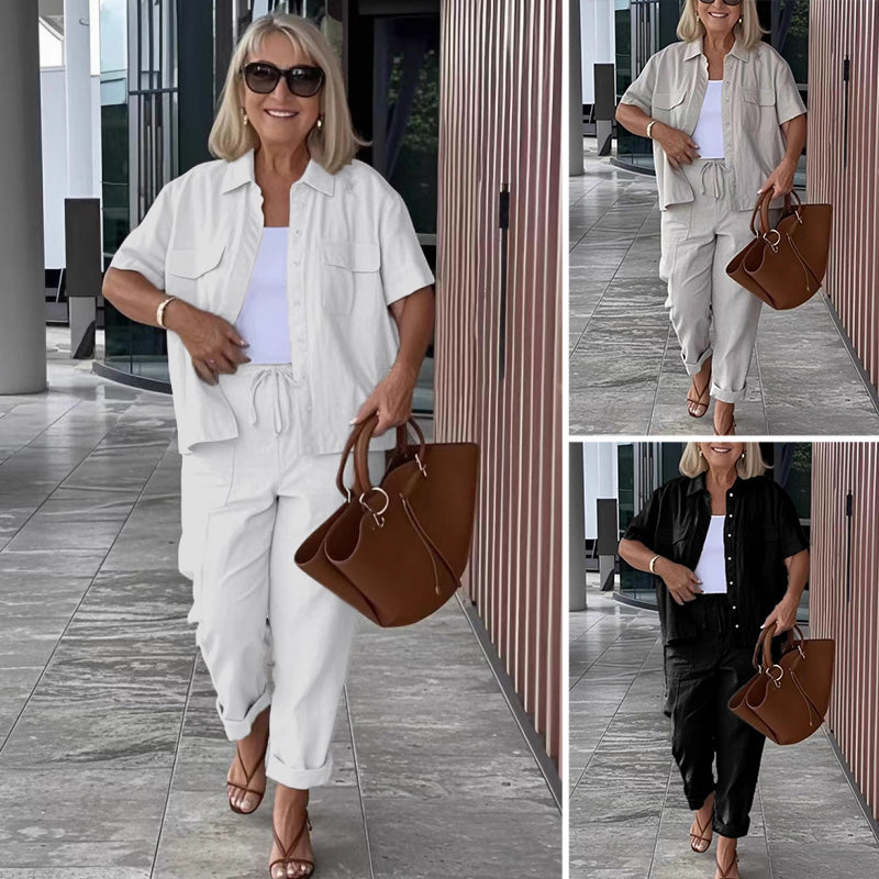 A készlet 1 x pamut és vászon rövid ujjú inget és bő nadrágot tartalmaz.