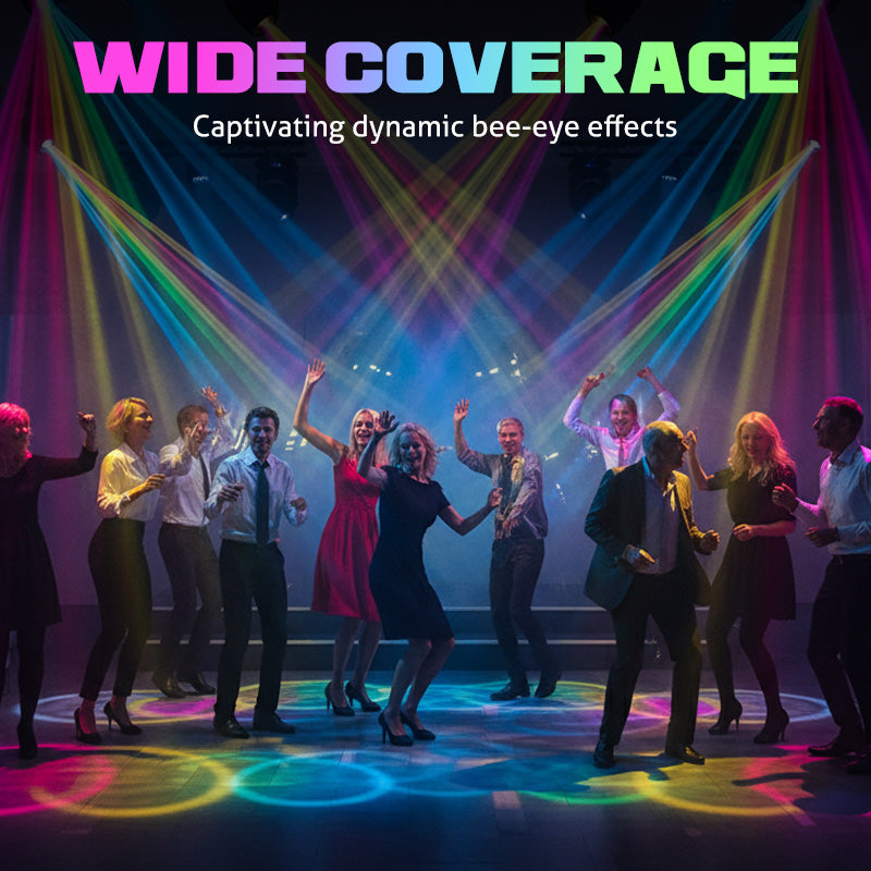 INTEGRÁLT BEE-EYE LENCSE - A központi bee-eye lencse több éles sugárral hipnotizáló wash hatást kelt. Mélységet és komplexitást ad a világítási beállításhoz, professzionális minőségű vizuális élményt nyújtva színpadokon, klubokban és partikon.