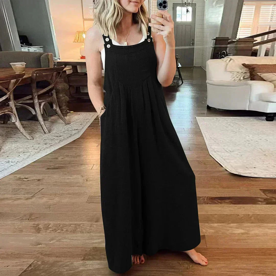 Kényelemre készült, minden olyan embernek tervezve, aki arra törekszik, hogy jól érezze magát. Ez a női ujjatlan, széles zsebes női kezeslábas laza szabású, maximális mozgásszabadságot biztosít a testednek, különösen alkalmas elhízott nőknek és terhes nőknek 👗🤰. Akár otthon lustálkodsz, akár sétálni indulsz, olyan lazán és kényelmesen fogod érezni magad benne, mint még soha 😊✨.