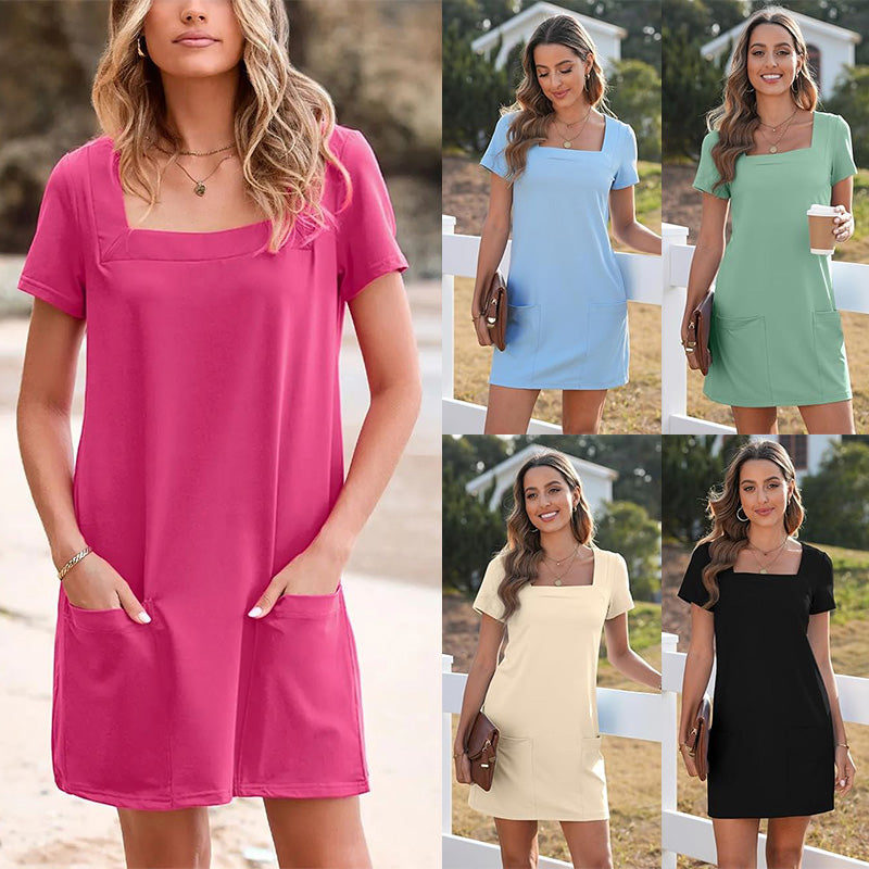 💕Rövid ujjú mini ruha zsebekkel, szögletes nyak, mini hosszúság, laza szabású stílus, könnyen fel- és leöltöztethető.