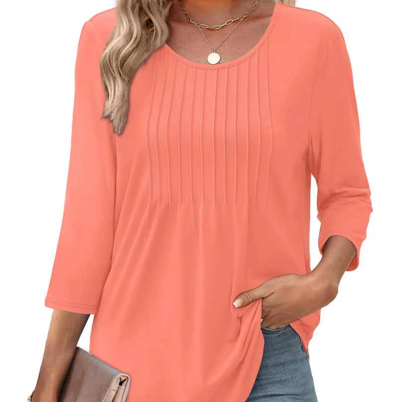 NŐIES FODROS ELÜLSŐ DIZÁJN: A finom fodrok az elülső részen elegáns, nőies hangulatot kölcsönöznek, és a póló egyszerűségét feldobva egyedi, figyelemfelkeltő megjelenést kölcsönöznek.