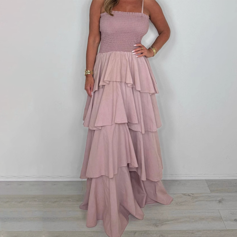 ROMANTIKUS EMELETES SZILUETT - A négyrétegű fodros szegély romantikus mozgást hoz létre, álomszép „réteges torta” hatást keltve, amely minden lépésnél kecses mozgást biztosít. A hízelgő A-vonalú szabás kiemeli a természetes görbéket, miközben fenntartja a kényelmet.