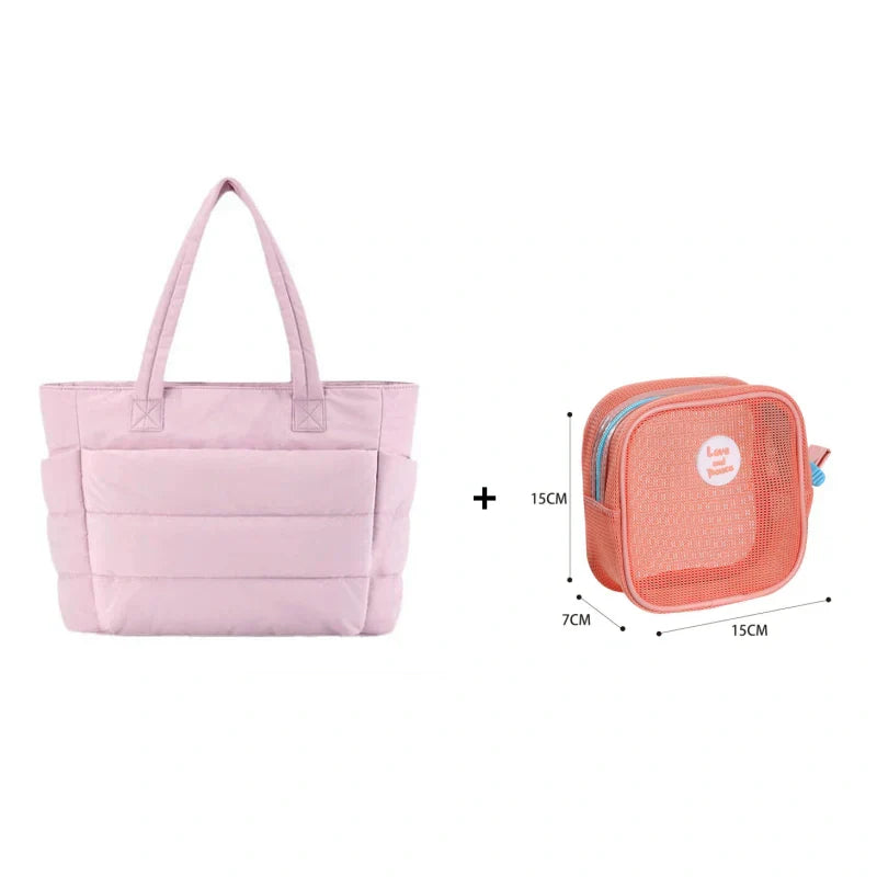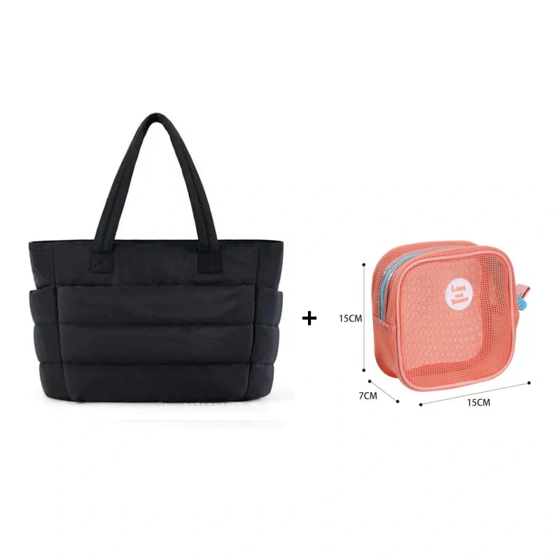 ✨Ultra könnyű anyag: Mindössze 0,45 kg súlyú. Tartós, puha és könnyű poliészter anyagból készült. A pufi tote táska könnyen hordozható, és ideális választás utazáshoz.