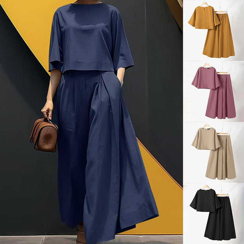 ELEGÁNS TERVEZÉS - A felső kerek nyakú és 3/4-es ujjú kialakítása stílusos megjelenést kölcsönöz, míg a nadrág széles szárú kialakítása kiegészíti az összképet. Ez a kombináció laza, mégis kifinomult megjelenést eredményez, ideális azok számára, akik kényelmesen szeretnének kinézni, anélkül, hogy feladnák a kényelmet.